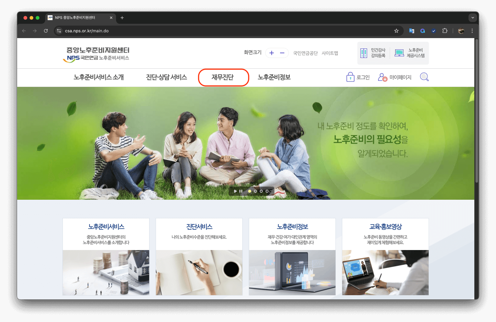 상단 메뉴에서 재무진단 → 내연금 알아보기로 들어갑니다.