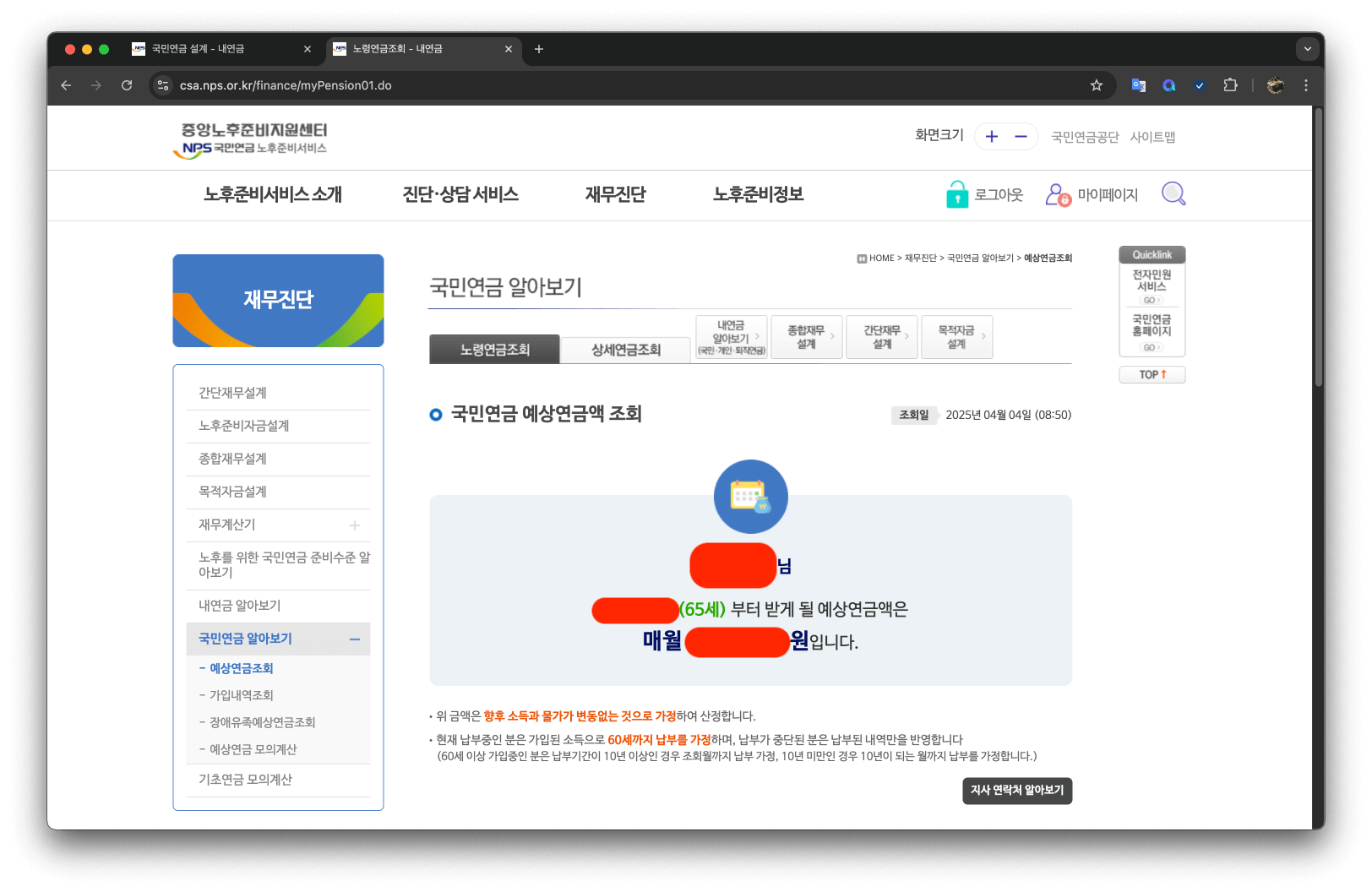 4. 예상 연금 수령액 확인