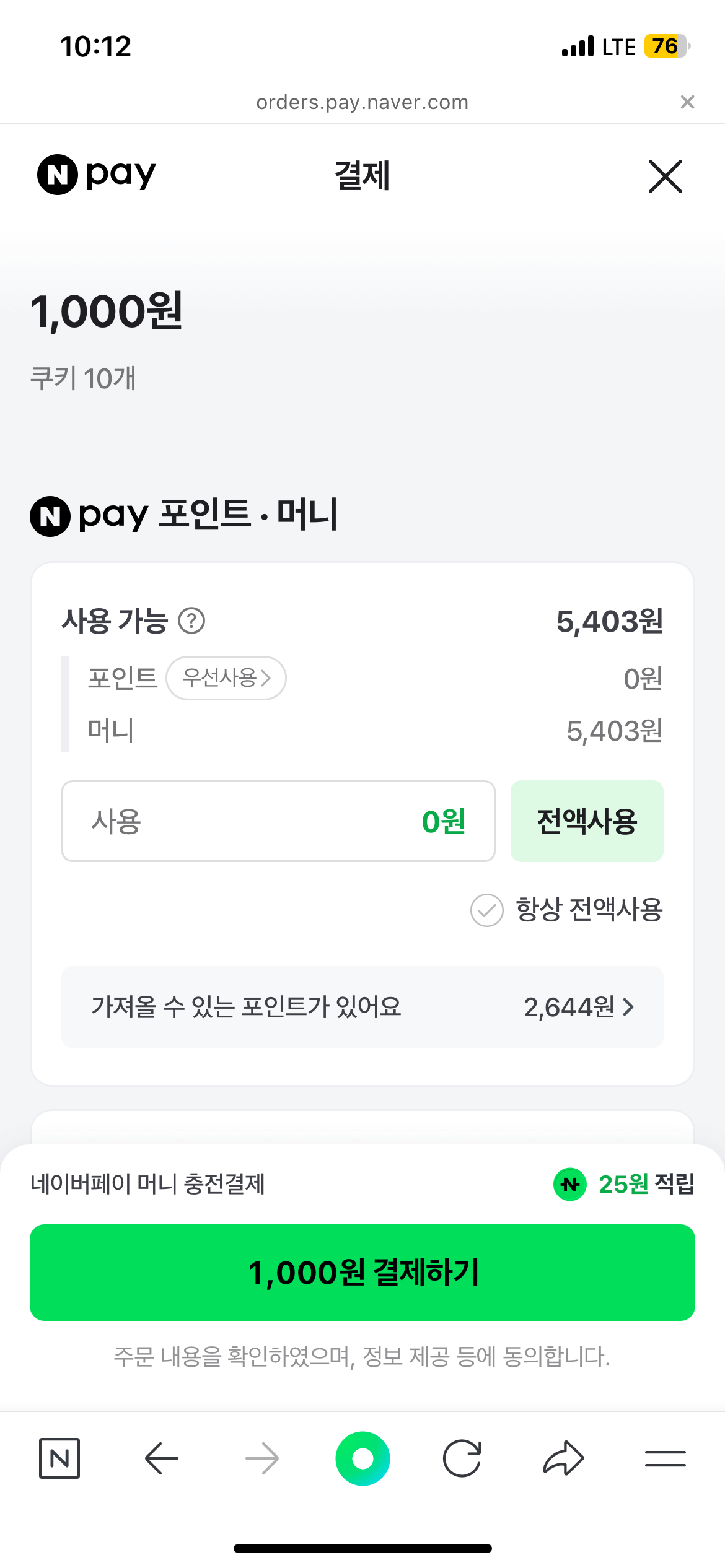 쿠키 결제 화면 -> 쿠키 1개에 120원 ! -> 네이버페이 포인트로 결제!