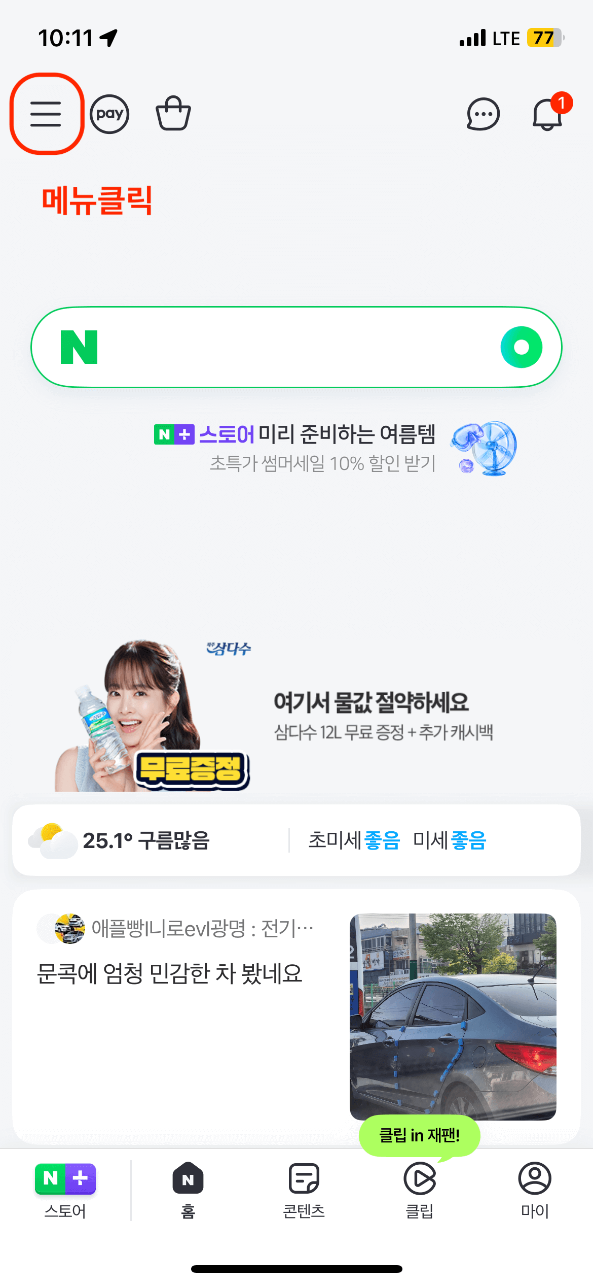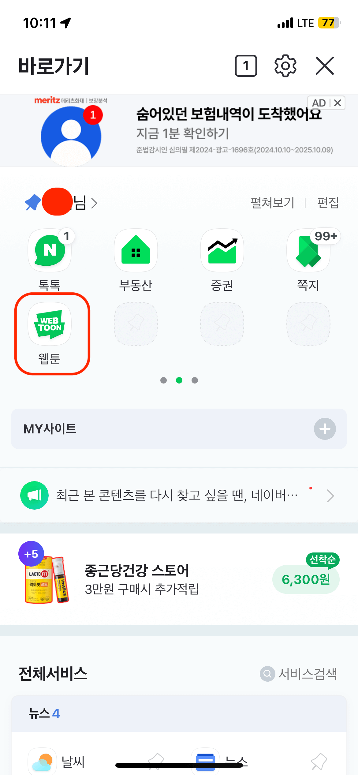 네이버앱 실행 -> 메뉴에서 웹툰 바로가기 -> 네이버웹툰 내 MY화면으로 이동