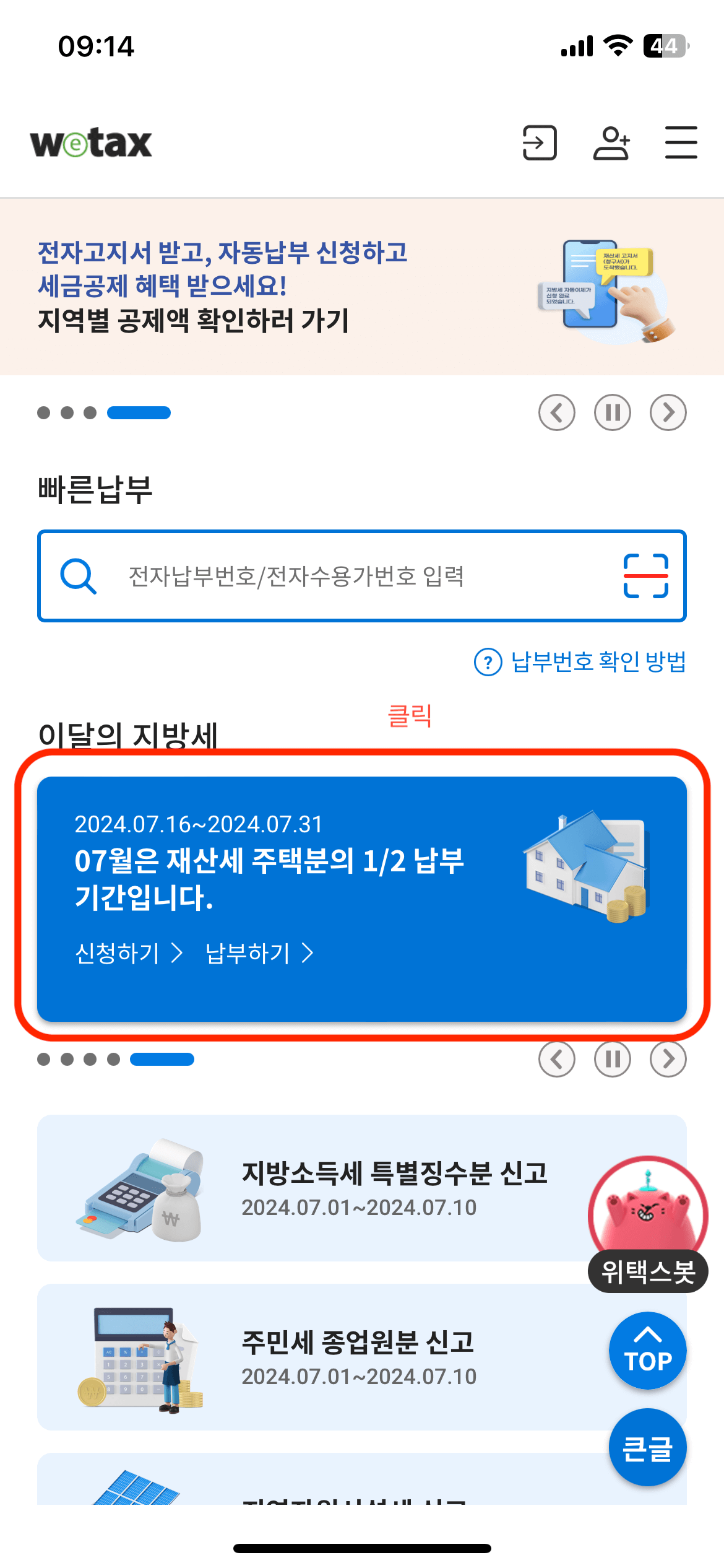1. 위택스 앱 메인에 보면 재산세 납부 대상 확인 배너가 있습니다. 클릭하여 로그인 하여 재산세 납부대상 확인을 하여 재산세 납부 대상이라면 재산세 납부 진행을 하시면 됩니다.